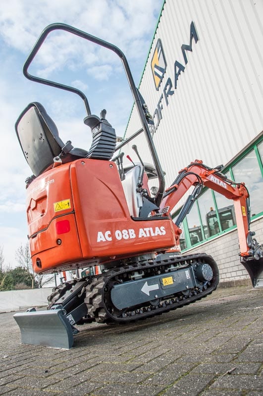 De Atlas minigraver AC 08B, is ideaal voor werkzaamheden op diverse werklocaties zoals op landbouwgrond, in tuinen, voor gemeentelijke engineering en onderhoud van wegen. Het is de kleinste van alle Atlas minigravers, maar groots in prestaties. Zeker voor zijn klasse. Een hydraulisch verstelbare onderwagen van 74 cm naar 90 cm, een klapbare veiligheidsbeugel met hijspunten, een zwaailamp en een extra functie zijn standaard. De joysticks van deze minigraver zitten langs de stoel voor een ergonomische werkhouding. Optioneel met snelwissel. Dit is een veelgebruikte minigraafmachine voor o.a. hoveniersbedrijven.